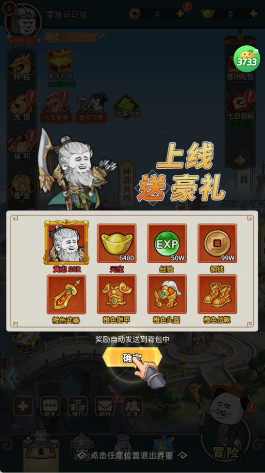 1、创角就送SSR黄忠+6480元宝+一套橙装+50w经验+50w铜钱