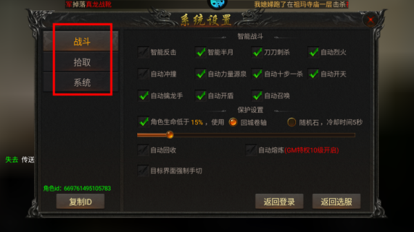 3、即可对战斗、拾取、系统三方面进行自动设定。