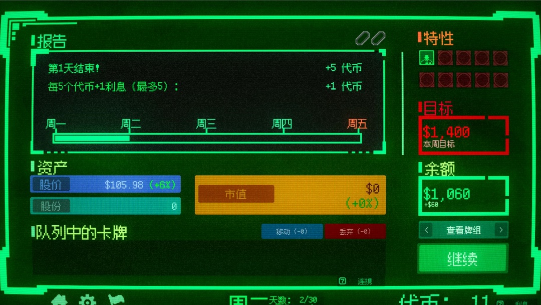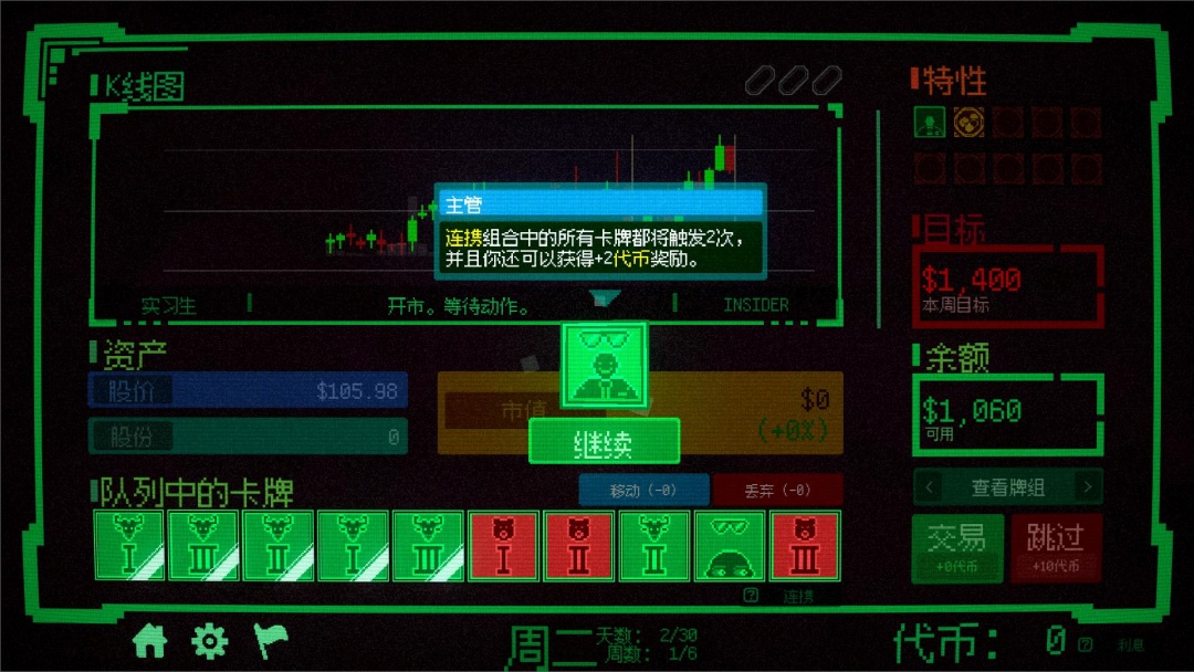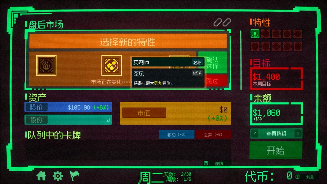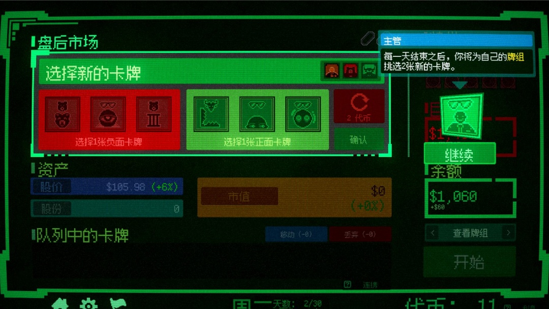 7、每日交易结束后,会有一个盘后交易,盘后交易就是可以在此购买卡牌,填充你的卡牌组,类似小丑牌