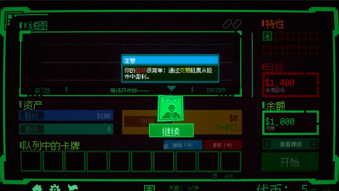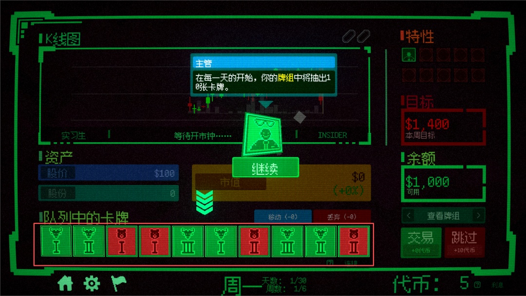 这并不是一款股市交易模拟游戏。这是一个由你的选择构成的牌组构建游戏。在休市期间,你可以前往盘后交易市场并在不同卡池中抽取手牌,但要小心,收益往往与风险并存。有些卡牌能够让牌组变得更强。有些则恰恰相反。开市之后,你只能够依赖精心构建的牌组来左右股价走势。