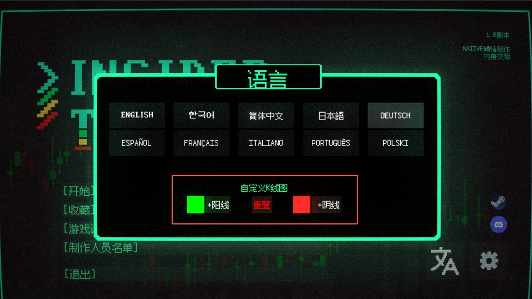 2、红色卡牌代表股票下跌,绿色卡牌代表股市上涨(也可以调整为红色上涨,绿色下跌)在语言设置界面可以进行调整