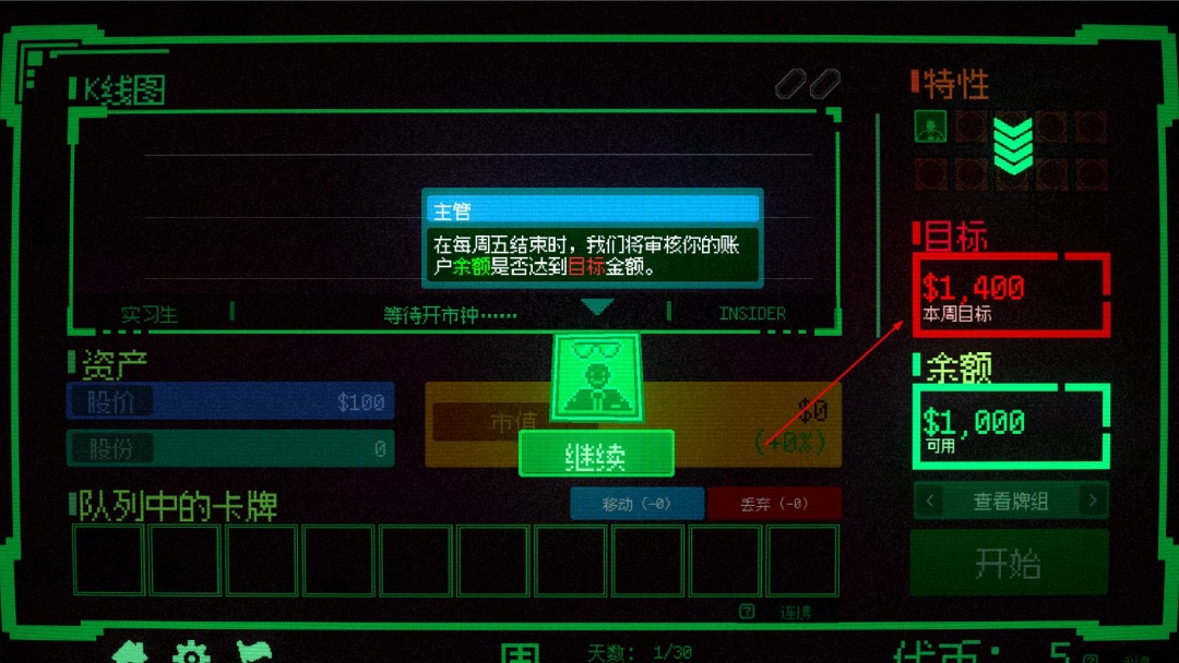 在每一局游戏中,你都需要围绕“本周的财务目标”不断调整策略。过于冒进将会导致股价虚高难以买进。过于保守意味着只能眼睁睁看着机会溜走。