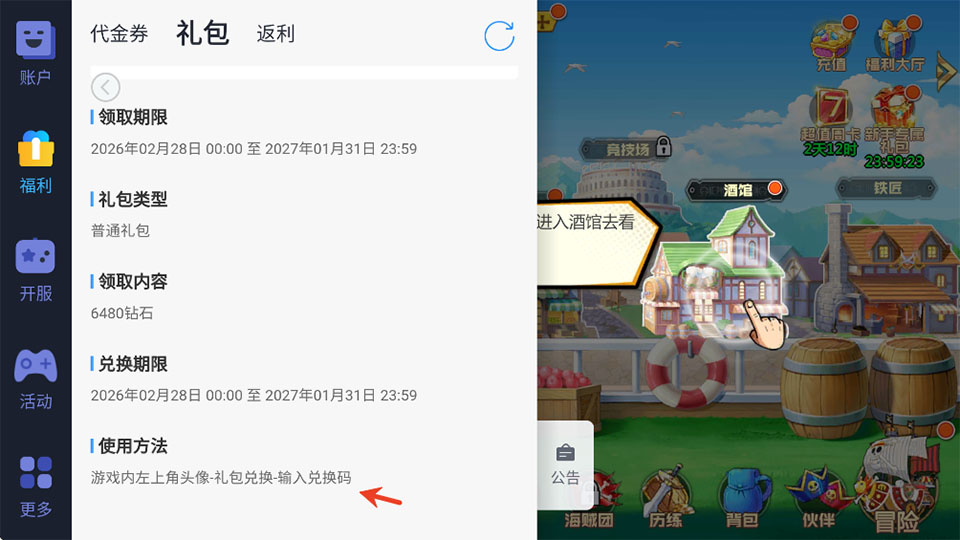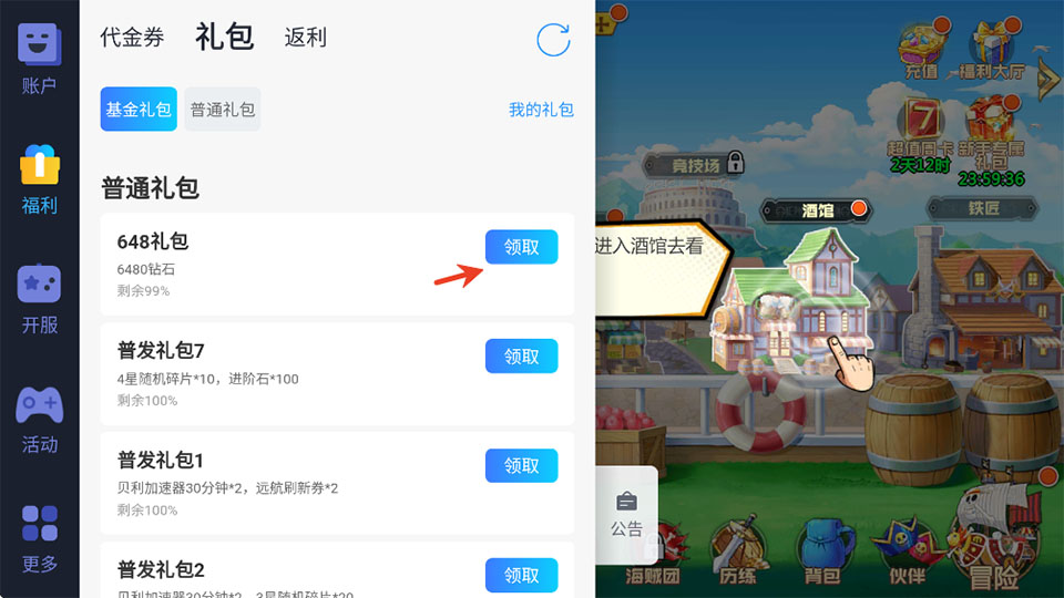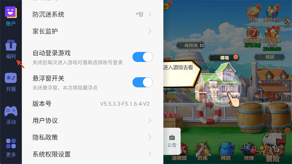 1、进入游戏内选择小弹窗,在选择左边的福利。