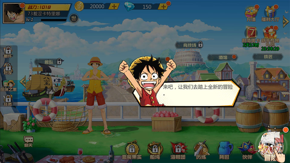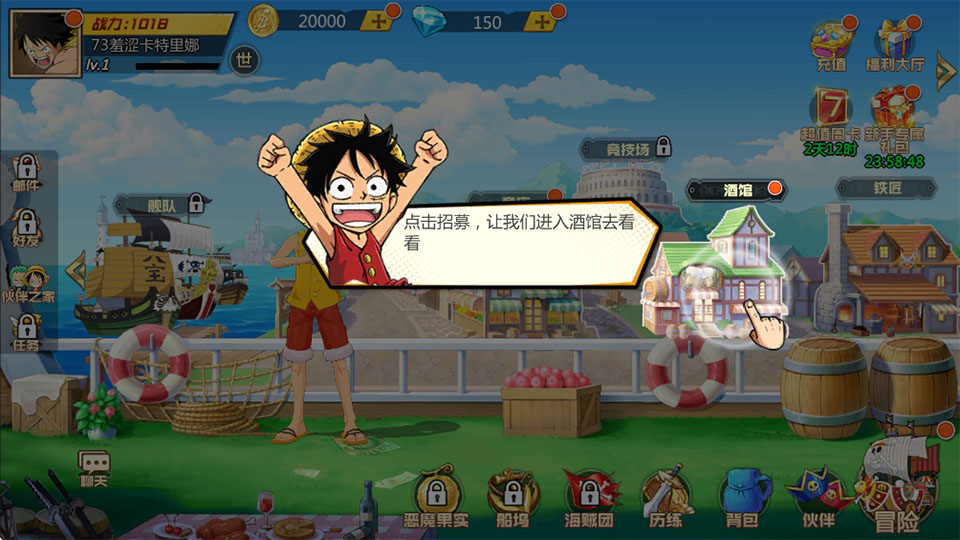 游戏特色鲜明:首充仅需1毛就能获得UR萨博和黄金装备;次日登录送5星黑胡子,8日登录还能解锁5星萨博。此外,限时升级、通关奖励和排行奖励也提供了大量资源和稀有道具。新手攻略简单易懂,玩家通过招募同伴、选择冒险和自动战斗即可快速上手。