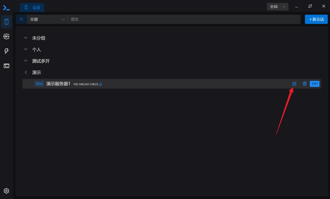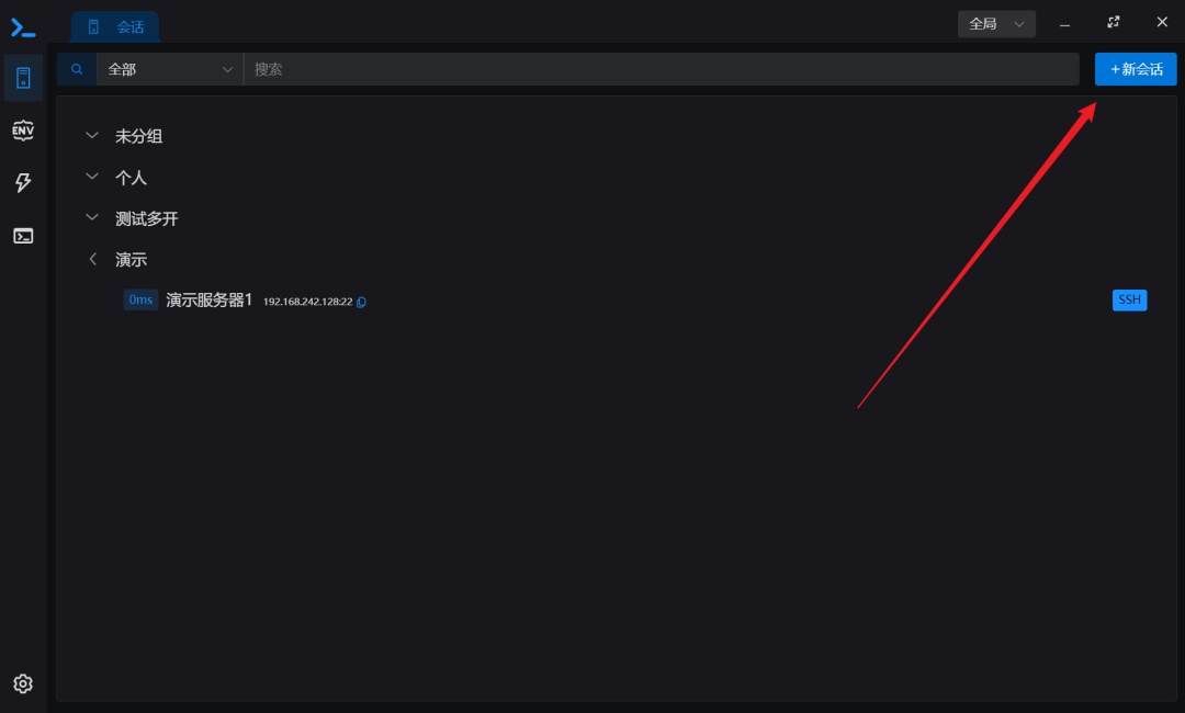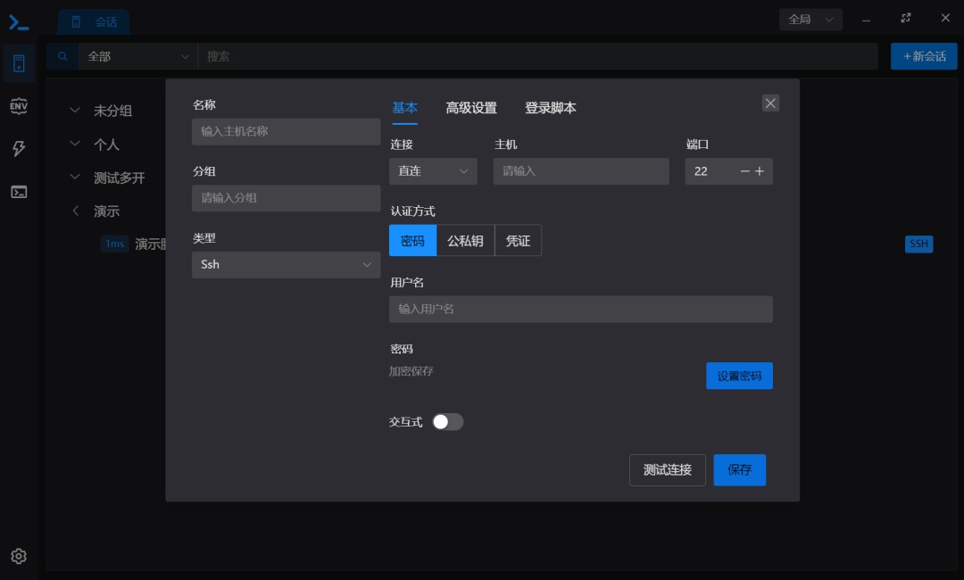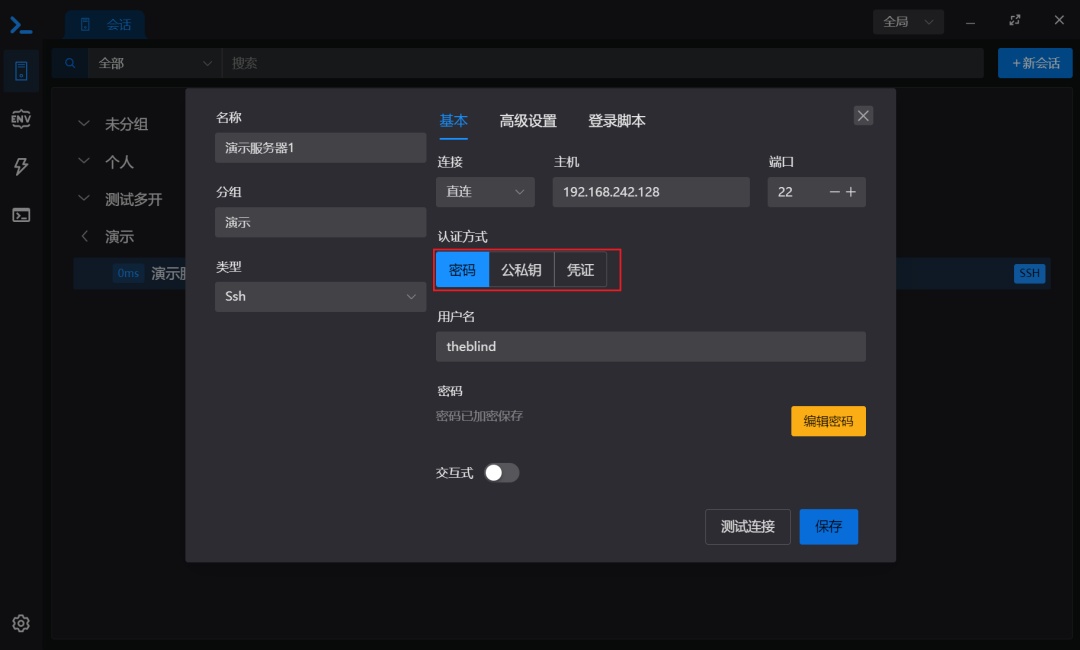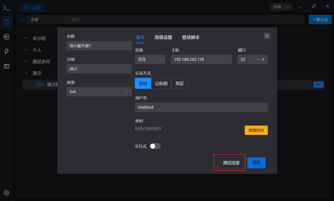 在创建会话时,可以点击测试连接,来测试填写的信息是否正确