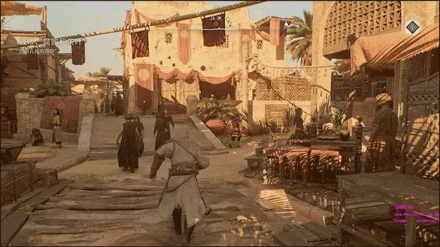 从鸟瞰点一跃而下,我们就能进入这个充满勃勃生机的城市,路人三三两两地在市井间穿行,在摊位前与商贩讨价还价。还有人骑着体型硕大的骆驼缓步穿过街道,也有人赶着瘦小的毛驴在河边徘徊,巡逻的卫兵则盯着城市的一举一动,随时准备解决麻烦(比如被通缉的主角)。