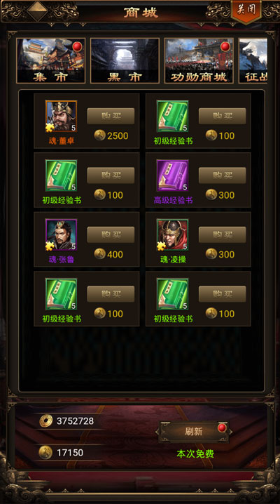 1、集市:每天买5次,完成日常任务就行,建议买粮草、训练材料,顺带买《特级经验书》,后面升级书不够用。