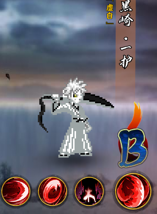 斩月的化身,虚白的平A共有5A,虚白前两A向前劈砍,之后3A冲刺斩击,4A往后上劈,最后跳起进行一段连续的空中连斩。虚白会通过转刀获得能量条,能量满时技能将会消耗能量获得强化。