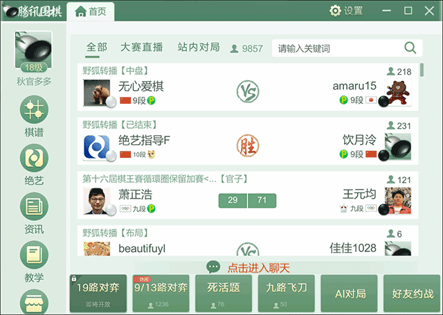 腾讯围棋电脑版是一款由腾讯公司开发的在线围棋游戏,拥有多种玩法,比如和其他玩家对战、与AI对弈,还能看职业比赛。它还有记录棋谱、评论和分享的功能,方便玩家回顾和交流。这款游戏因为操作简单、功能齐全以及强大的AI引擎,成为了很多围棋爱好者的首选。