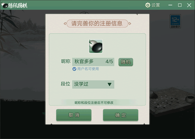2、在这里填好你的昵称和选择好你的段位后就可以点击确定键来完成注册了;