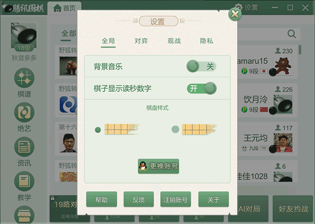 5、在大厅中可以选择并点击“设置”的按钮选项来对对弈、观战、隐私进行调节;