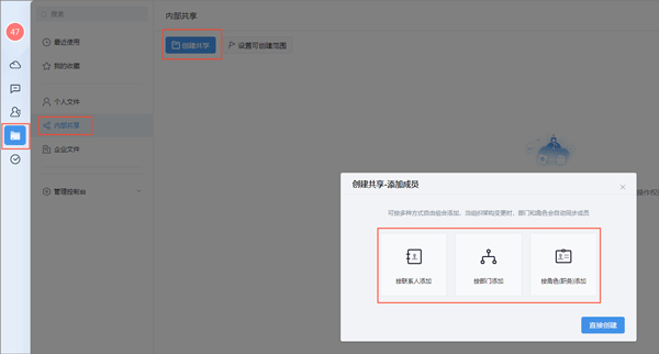按联系人、部门、角色添加共享成员,仅添加的成员可以查看文件夹内的文件。