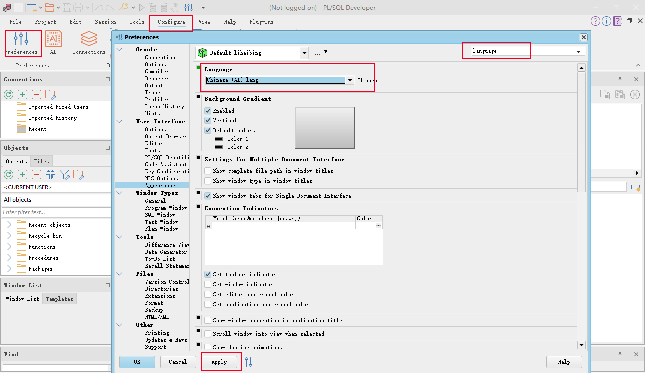 configure--preferences--搜索language--选择chinese(ai).lang就是简体中文--apply即可;