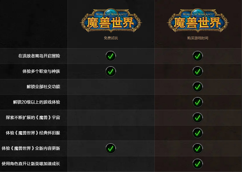 包括免费试玩全部内容,以及解锁全部社交功能、解锁20级以上的游戏体验、探索不断扩展的《魔兽》宇宙、体验《魔兽世界》经典怀旧服、使用角色直升让新英雄加速成长。