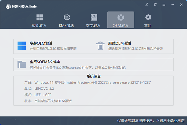 四、OEM 激活(Win7/8/10):支持 OEM 激活 Windows Vista、Windows 7、windows server 等版本,提供 6 种模式,部分版本激活时,为防止开机无法启动的问题,只使用了硬激活,对于这类需要 OEM 激活的版本,可以切换到 OEM 激活页面中,点击“OEM 激活”按钮,会采用硬激活 + 软激活。