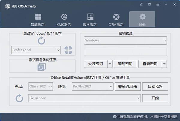 除此之外,工具还提供了其他实用功能,比如备份和还原激活信息、转换Office零售版为批量许可版等。这些功能让操作更加灵活,满足了不同用户的需求。软件的特点包括高成功率、快速执行以及支持几乎所有版本的Windows系统。