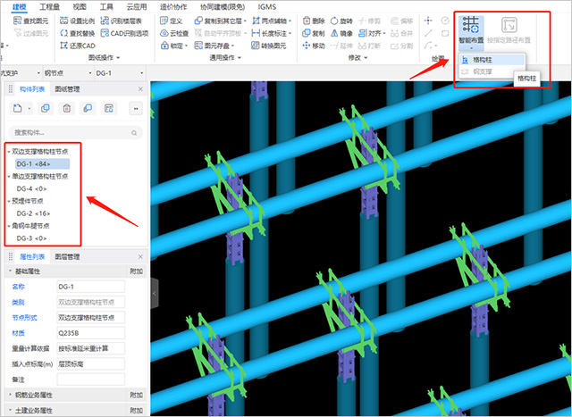 通过参数化图实现格构柱/钢桩建模,内置型材表,便捷出量。支持智能布置方式,快速批量布置格构柱/钢桩。