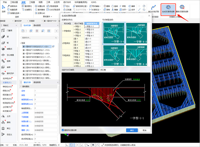 一键生成支撑梁加腋,土建及钢筋工程量计算快速且精准。