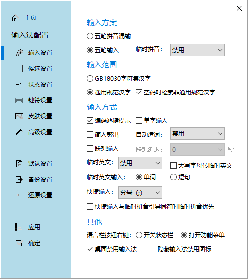 1、打开冰凌五笔输入法官方版,进入软件主界面,用户可根据习惯进行【输入设置】、【候选设置】、【状态设置】、【键符设置】、【皮肤设置】、【高级设置】、【默认设置】、【备份设置】和【还原设置】等相关的设置,