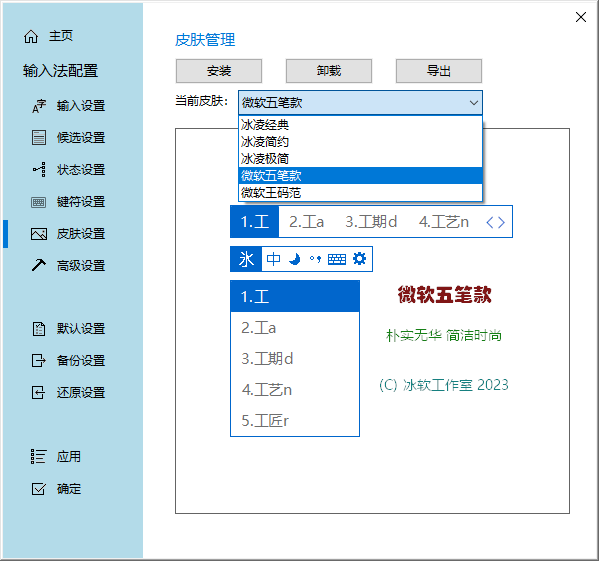 6、在【皮肤设置】界面,可以安装、卸载、导出和切换不同的输入法皮肤,