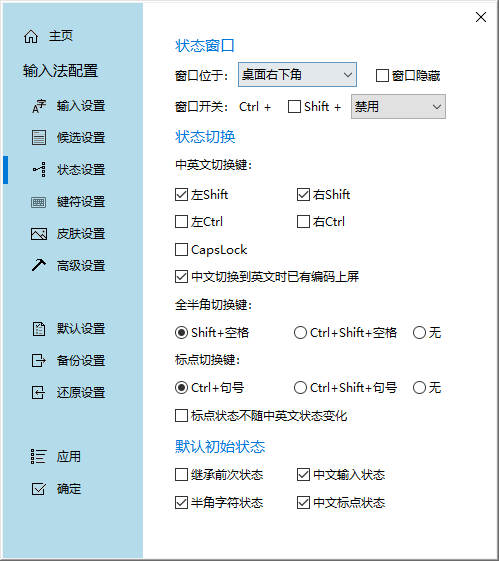 4、在【状态设置】界面,可进行状态窗口、状态切换和默认初始状态等设置勾选,