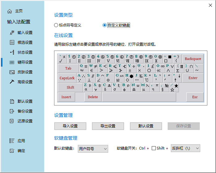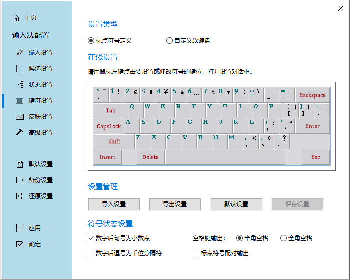 5、在【键符设置】界面,可设置标点符合和自定义软键盘,