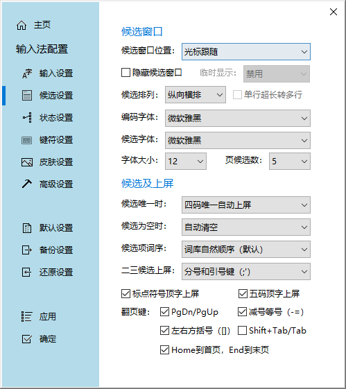 3、在【候选设置】界面,可进行候选窗口和候选及上屏等设置勾选,