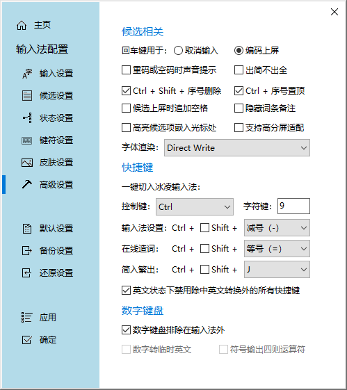 7、在【高级设置】界面,包括候选相关、快捷键和数字键盘的设置选项,