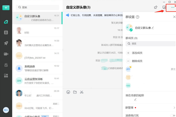 在群会话窗口,点击右上方的“…”图标,进入群设置窗口