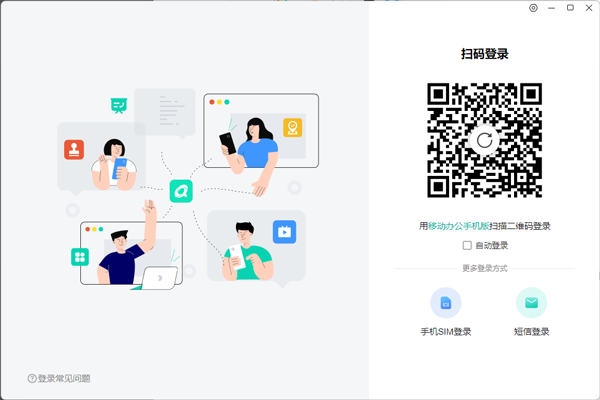 1、启动移动办公 PC 客户端,进入登录窗口,选择扫描二维码、短信验证码以及勾选自动登录的方式登录。可手动切换短信验证码与扫描二维码登录方式