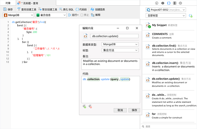 在查询编辑器中插入一组代码段,以便更快速无误地编写查询。