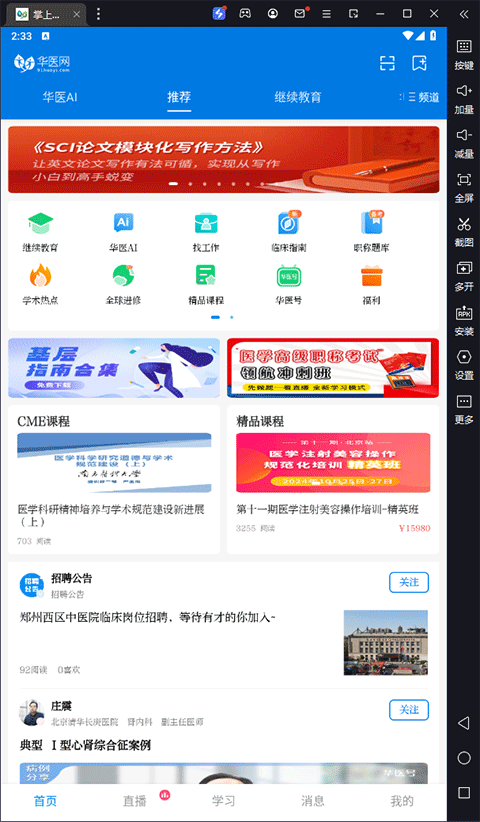 掌上华医电脑版是一个通过安卓模拟器运行的医学服务平台,主要面向医学生和从业者。它提供各种医学课程、活动动态以及病例库资源,用户可以根据自己的兴趣和学习进度选择内容。软件的一大亮点是拥有国内最大的医学病例库,方便用户上传病例并与同行讨论,这对提升学习效果很有帮助。