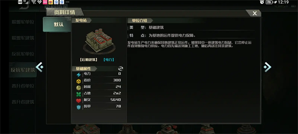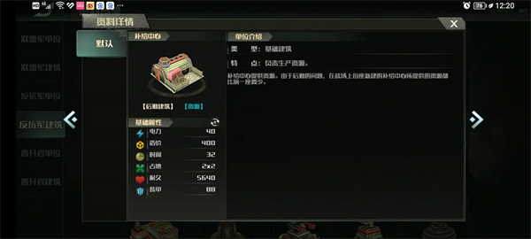 所有建筑都是Ill级甲(也就是游戏中的重型装甲)为了方便,游戏中的补给点统一都用(钱/资源)来表示,电力用(度)来表示,耐久用(生命/血)来表示