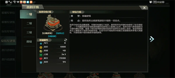 其他建筑生命值普遍偏少的反抗军都指挥中心却在1到3本比其他两个阵营要多,分别为:1本19100血,94甲