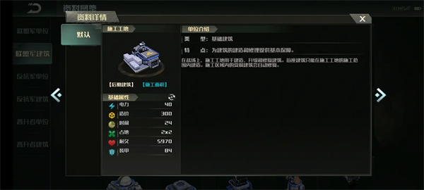 指挥中心作为核心建筑,生命值和护甲都很重要,尤其是国服版本,被打爆就意味着失败。施工工地、发电站和补给中心是资源和电力的核心来源,而超级武器则为玩家提供强大的 offensive 能力。每个建筑都有独特的建造要求和占地面积限制,地形也会影响战略布局。
