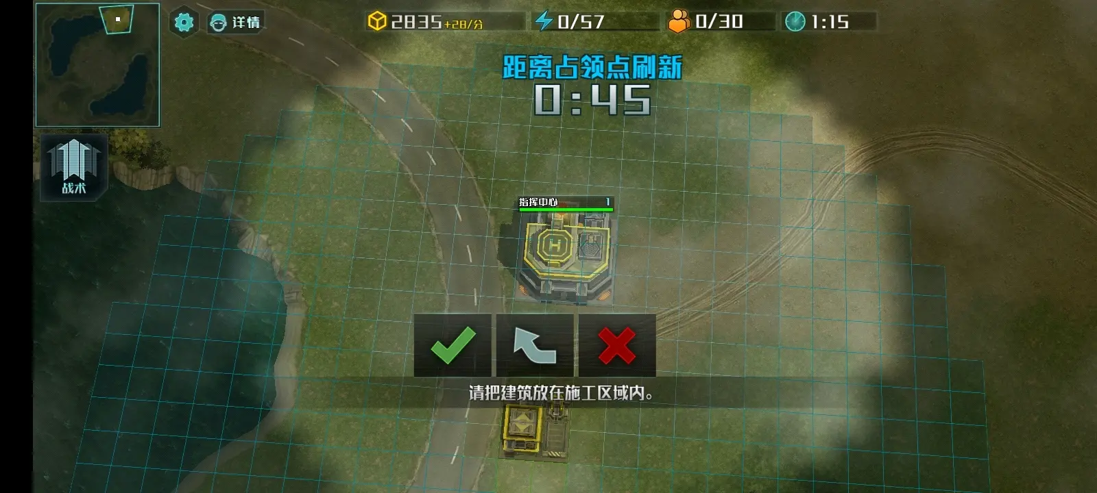 指挥中心占地3×3,正四边3×4的区域不能放其他建筑