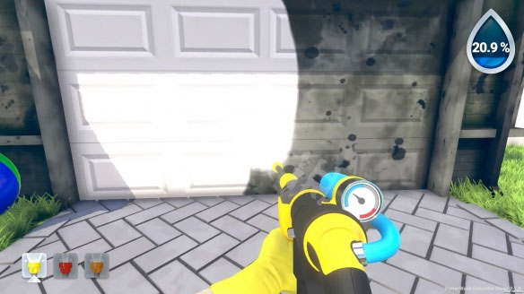 清理的时候还可以按下TAB显示脏污未清理的区域,脏的地方会黄色高亮突出显示,有的地方比较高怕冲不到,也可以拿起在你身边的小凳子摆放到一个合适的位置跳上去喷射,更高的地方也会提供梯子等设备。