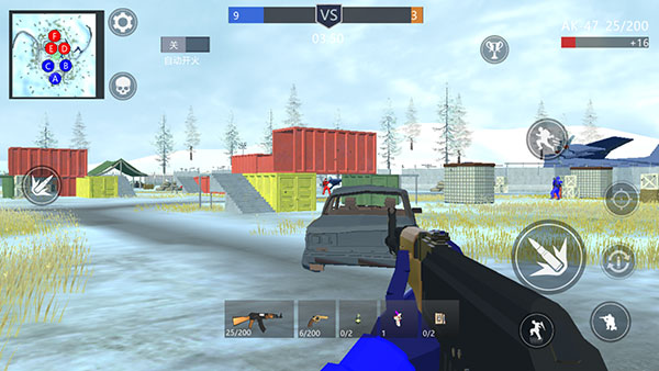 6、左下角滑动轮盘进行移动,右下角按键控制人物射击、跳跃、下蹲等功能。