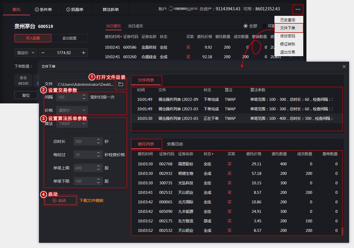 软件扫描Excel文件里编辑好的交易指令自动下单,且支持多个文件批量扫描、控制扫描间隔,还支持自动分批下单,高效、快速、准确!