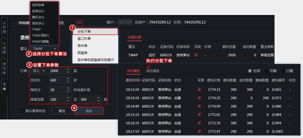 内置多种算法,无需编写代码,填写参数即可进行分批下单。