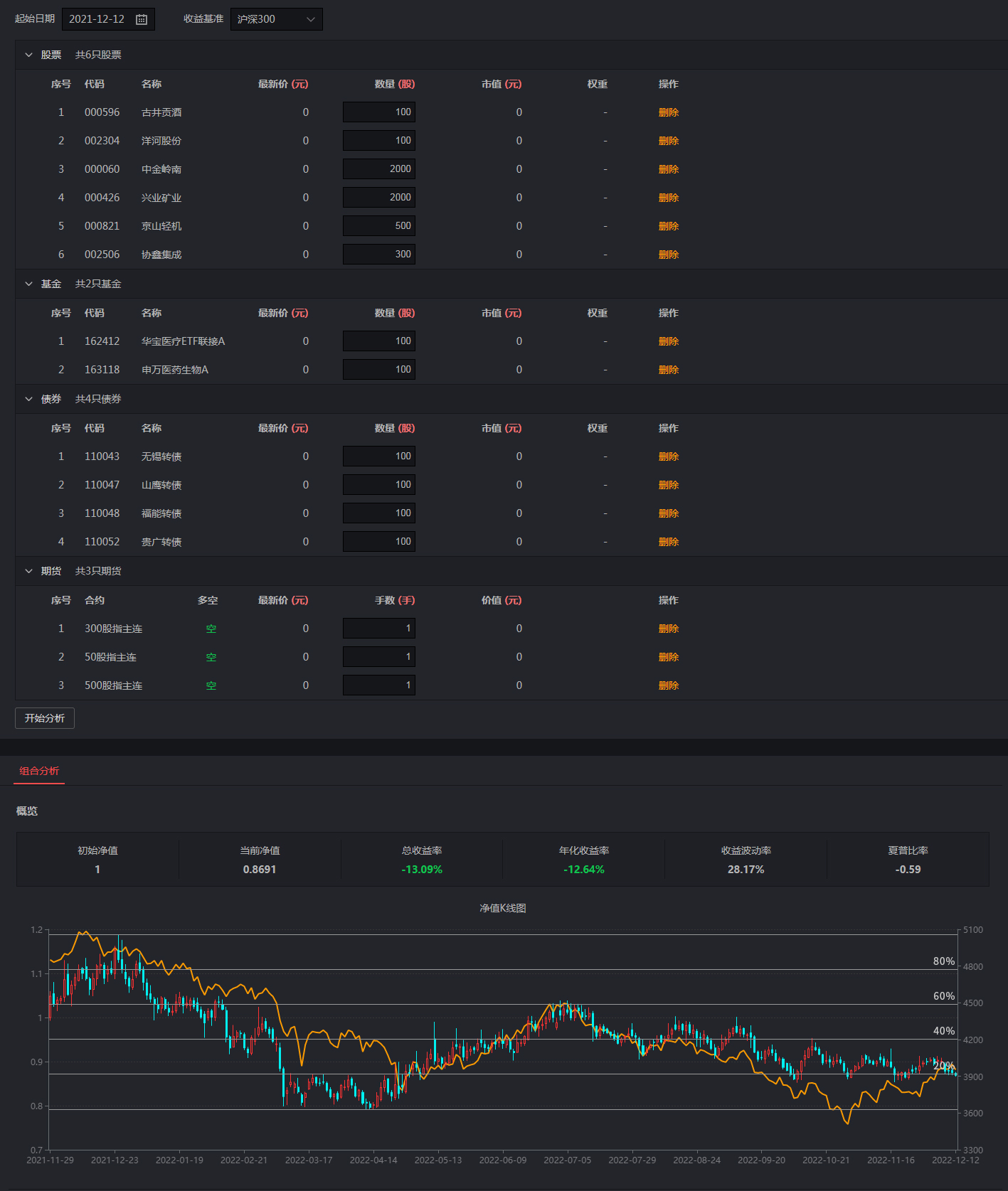 历史分析可将一篮子股票、基金、债券、期货合成一个投资组合,并提供了组合净值K线,可代替个股K线数据,实现相同逻辑的价格百分位判断,寻找最佳入场时机。还可借助盈亏分析、行业分析工具优化组合配置,构建最优投资组合。