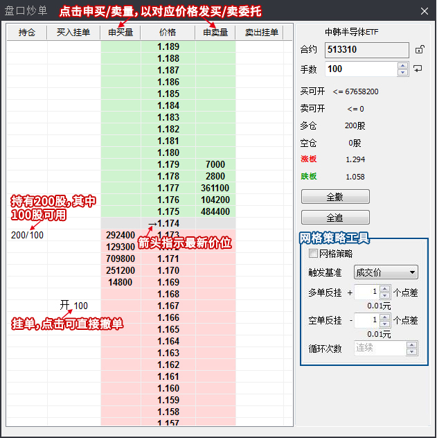 盘口炒单工具将盘口中的各档价格和挂单量直接显示在交易界面中,通过点击价格对应的买卖量,达到以指定价格发送委托的效果,省去了频繁输入价格的繁琐操作,更适合在挂单交易策略中使用。