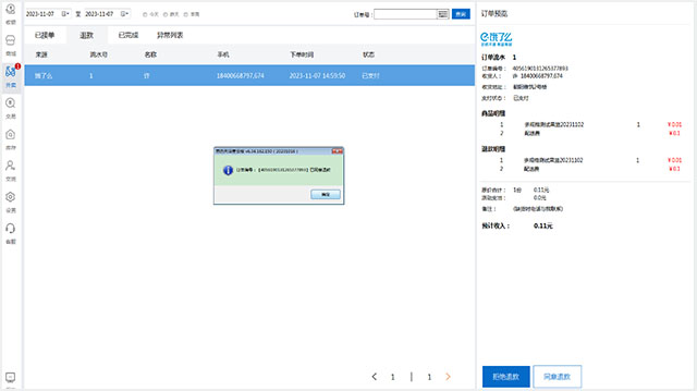 天店平台此界面仅支持小票”重打印”和订单状态扭转为”已完成”和”取消订单”。