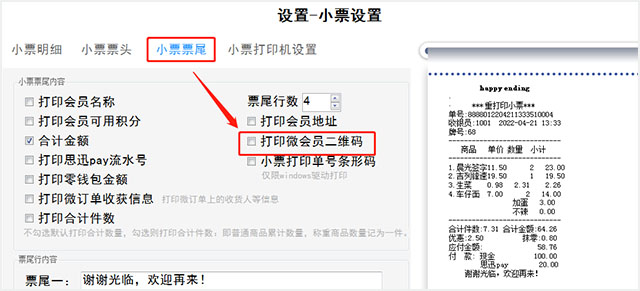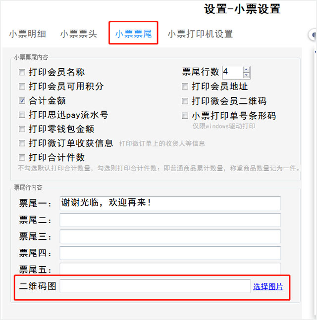 在设置-小票设置-小票票尾中,选择图片上传票尾logo图片。