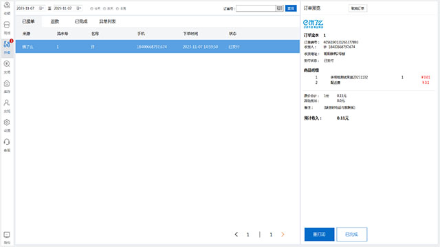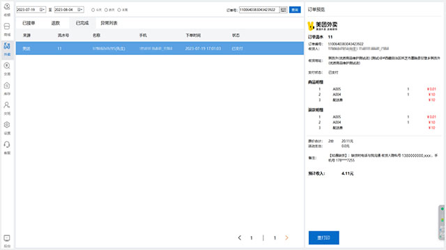 (1)已接单:客户外卖平台下单后,此界面会接收到订单信息,手动点击确认然后点击重打印小票;
