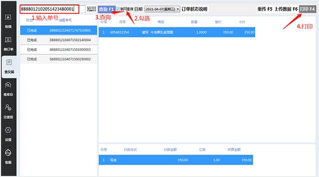 1.输入单号; 2.勾选联网查询; 3.点击查询; 4.点击打印。