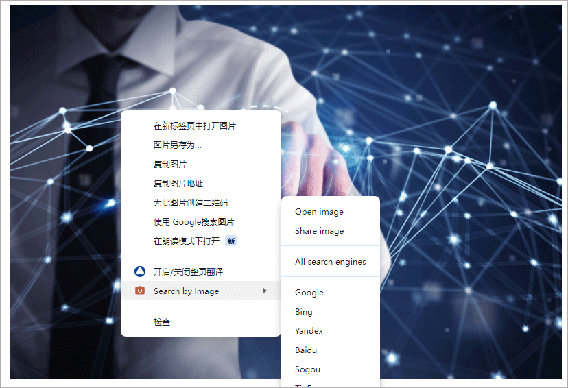 •选择图像:在页面上选择一个图像,然后使用图像文件进行搜索。对于不允许直接链接图像(例如私有站点)的站点,此搜索模式是首选。