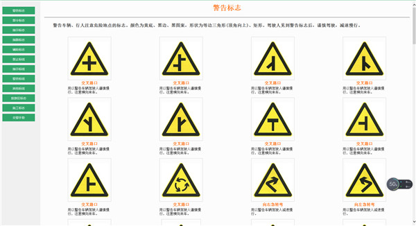 7、点击交通标志,里面有各种交通信号标志、警告标志、指示标志、交警手势、辅助标志、禁止标志、禁令标志;