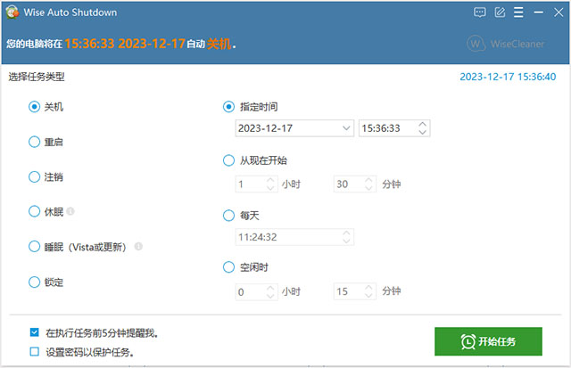 Wise Auto Shutdown时间设定十分灵活,用户除可以设定每天固定某个时间执行任务外,还可以设定在某个指定时间点,空闲时间,甚至是从现在开始几小时几分钟之后执行。最重要的是Wise Auto Shutdown会在执行设定任务前5分钟自动提醒,避免自动关机时措手不及,用户也可以根据实际情况选择推迟执行任务。