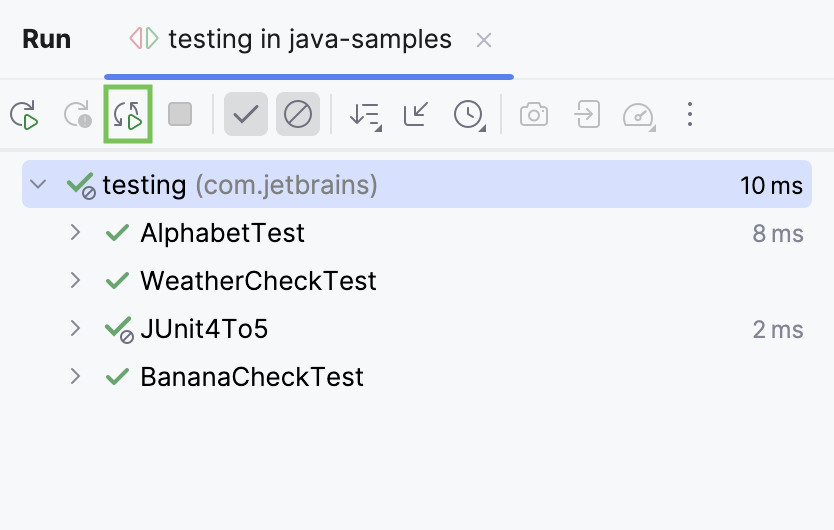 单击“重新运行失败的测试”图标测试结果工具栏以仅重新运行失败的测试。